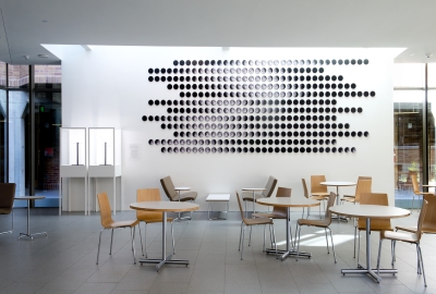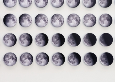Artists Rebecca Cummins and Paul DeMarinis' three-part installation ‘Lunar Drift' suggests an insight into our place in the universe. The images on these 365 wall discs were taken each day of 2014 when the moon reached the highest point in the sky and show the phases of the moon over Western Washington University in Bellingham, in Northwestern Washington. The images compliment the kinetic sculpture that tracks the position of the moon and the sun, as well as the 48 wall disc images showing the changes in the Bellingham sky throughout 2014.