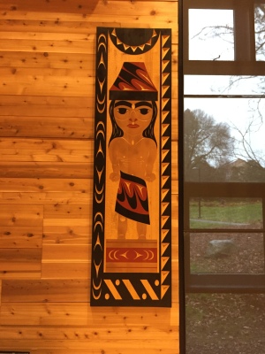 Male House Post Female House Post are two panels carved by artist Andrea Wilbur-Sigo (Squaxin Island/Skokomish). They were designed by Ruth Peterson and Andy Wilbur-Peterson who are important Skokomish artists and Andrea Wilber-Sigo’s parents. The two welcome figures are painted red and black to represent strength. The partial circle at the top represents the notch in the structure poles for the longhouse. The designs surrounding the man and woman represent the spirits of the ancestors, as well as those who are coming in the future. Andrea Wilbur-Sigo expressed that this project is part of a full circle in her life and artistic career. She was born at the UW hospital in 1975. She remembers as a child when her father, Andy Wilbur-Peterson, and Greg Colfax (Makah) carved the "Welcoming Woman" for The Evergreen State College, and she watched the Woman come to life. Now she is part of bringing these house posts to the UW, and she hopes that their spirits will help all who walk through the Longhouse doors.
