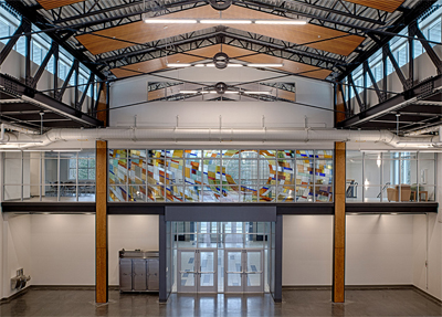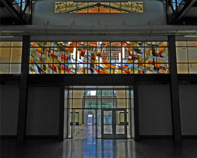 Artist Jack Archibald placed his glass mural New Horizon to look into the National Guard assembly room of the Pierce County Readiness Center. The composition emphasizes a dynamic, energetic, and complex movement of color and light. Reflecting on the responsibilities of the National Guard, Archibald notes "I wanted to evoke that reputation for rapid response" and states his hope that the piece "represents dynamism unleashed, power directed precisely through training and preparation."