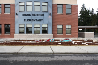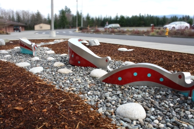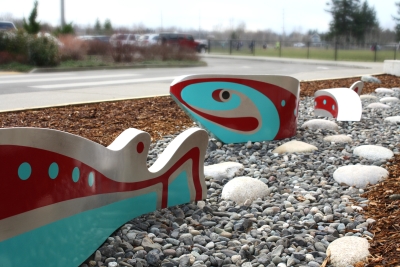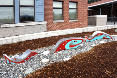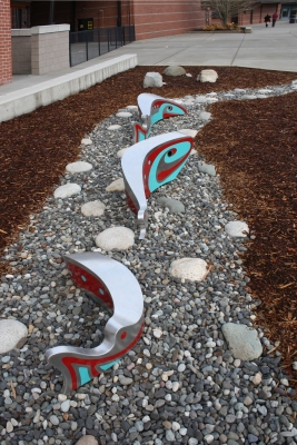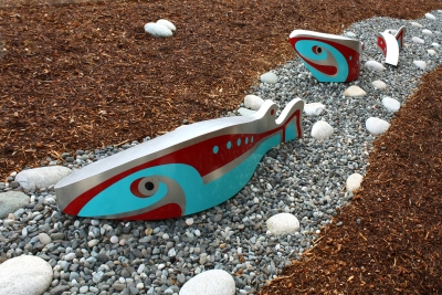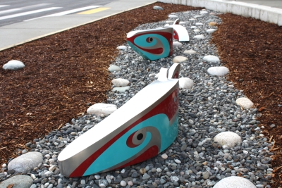 H2O-to-O2 is a sculptural installation by artist Greg Ragland, comprised of three stainless steel salmon forms in a gravel "stream." The artist invites viewers to "use your imagination to join in the shallow depths with the swimming Chinook salmon. H2O-to-O2 are not typical cold blooded fish. They are wonderfully warm engaging sculptural forms just waiting for you to pretend to swim with them." Ragland is a non-Native artist.