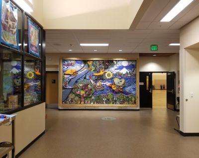 A Moment in Time is a glass mosaic by artist Mauricio Robalino. It tells the story of the area and neighborhood surrounding Garfield Elementary School in Olympia. It is designed to be tactile and full of small details that invite discovery. The artist notes, "With this mosaic, I attempt to stop time, and play with dimension, scale and texture to capture a moment and a place where the viewer can enter and play with their imagination and experience."