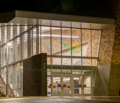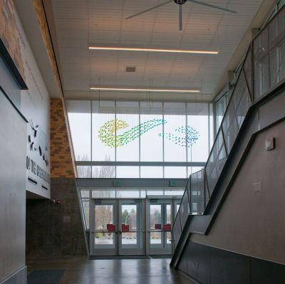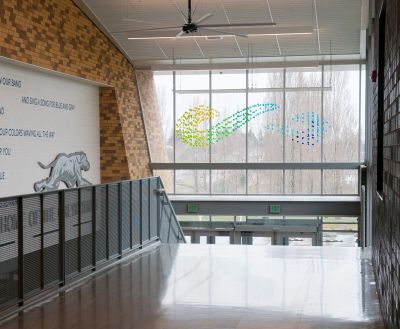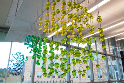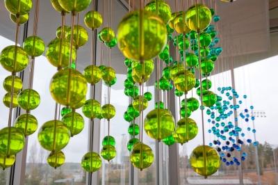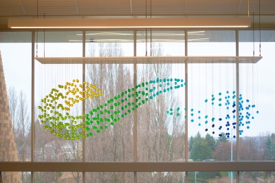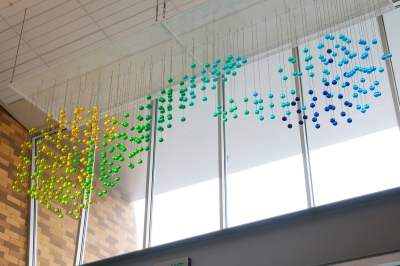 Floating Colors is an installation designed specifically for the entrance of Pullman High School in Eastern Washington. Artist Etsuko Ichikawa was inspired by “the soft curved landscape and its vivid colors, flocking birds, schooling fish, and words such as future forward, double rainbows, generations return, friendship.” As you explore the space from different floors and angles, from inside and outside, there are infinite ways to see the colorful dots line up in different arrangements that might prompt you to think about synchronization, natural formations, and harmony.