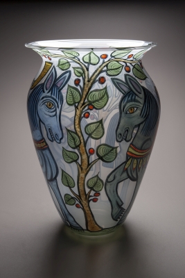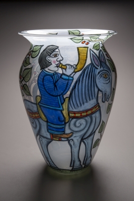 Artist Cappy Thompson's glass vase Horses and Pipers is part of a body of work featuring a horse and rider theme. Thompson notes, "For me, the horse is a symbol of friendship between the human and animal realms. The pipes are one of our earliest musical instruments—they evoke the idea of community with many reeds bound together. Music has the power to bring people together through harmony." The imagery on the vase was created using a method of glass painting called "grisaille" where black line drawings are painted on the glass with a glass-powder paint solution and then fired in a kiln to make them permanent. Grisaille has existed since medieval times (approximately 450-1450) and is what you often see in stained glass windows in European churches.