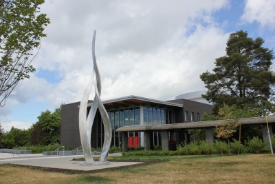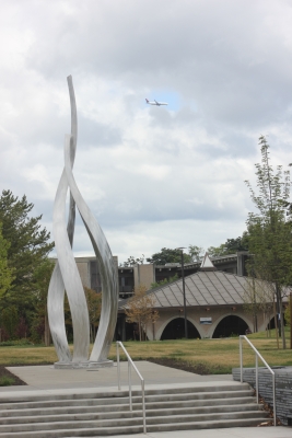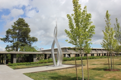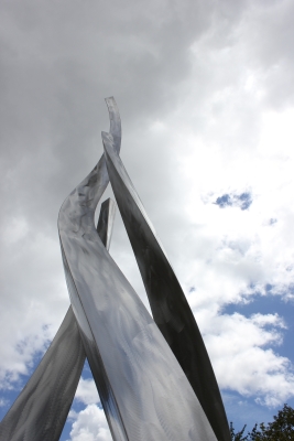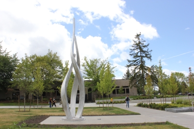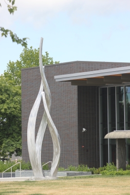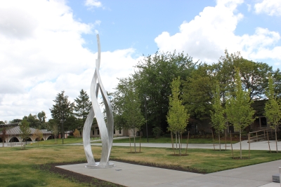 Enlighten is a monumental, kinetic sculpture by artist Micajah Bienvenu that celebrates "community, inclusivity and inspiration." Three spiral columns rise from a stainless steel turntable. The sculpture rotates with wind or human power. It is covered with interwoven sanding marks that add an ever-changing holographic finish that changes with the viewer's perspective and the artwork's movement. The local art selection committee wanted an interactive artwork that would create a gathering place and focal point for students, at the center of the South Seattle College campus.