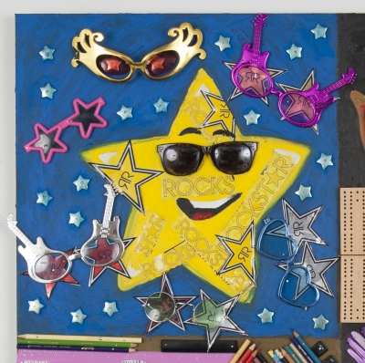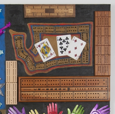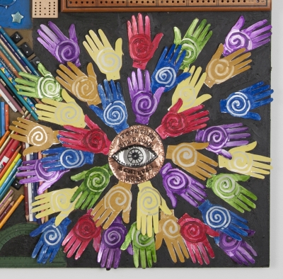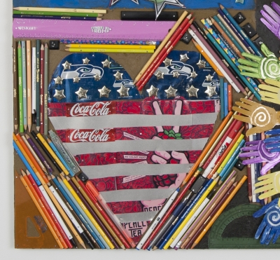 Ross Palmer Beecher's Sunnyside Up is a four-part artwork that uses found materials and objects to represent ideas of education and the culture of Sunnyside in Central Washington. The artist brainstormed with the art selection committee to find meaningful themes for the quilt. Then she gave her wish list of "supplies" to teachers and students, who set up a donation bin in the school. All of the found objects in the quilt are from the school or local thrift shops. For example, Beecher learned that the students at Washington Elementary play a lot of board games. She included quilt squares of chess, checkers, scrabble, cribbage, and card games. Altogether there are four quilts with a combined total of 26 different quilt squares. The imagery ranges from the farming communities, to student learning, to sunshine and sunglasses, to board games and sports, to Hispanic cultures, to astronaut Bonnie Dunbar who grew up in Sunnyside. Beecher notes that "I make traditional quilts and non-traditional quilts out of most anything besides fabric."