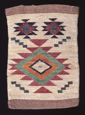This and numerous other bags made by Mary Ann Wapato were never used and were kept by the artist's daughter and granddaughter for future generations to appreciate. Wapato was a member of the Wenatchi band of the Colville Tribe. Little is known about her life. This bag was preserved by and acquired from the artist's granddaughter, Cecelia Sherman.