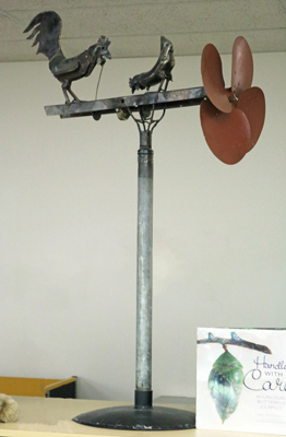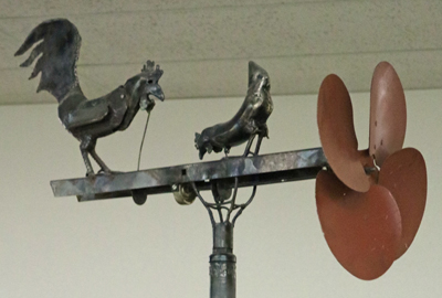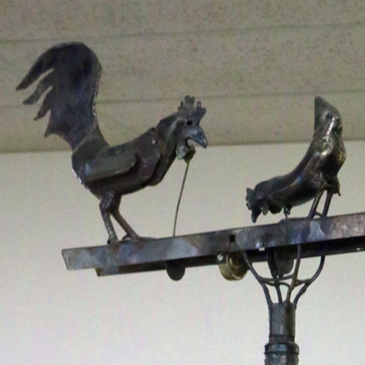 Artist Victor Moore created this kinetic, wind-powered sculpture for Naches Trail Elementary School. It is one of four whimsical whirligigs inspired by Tacoma's community and history. The figures in each whirligig tell a story using movement. This piece features a rooster and hen pecking at the ground. Even a slight breeze will cause the chickens to move up and down.