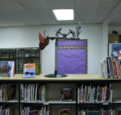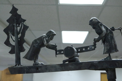 Artist Victor Moore created this kinetic, wind-powered sculpture for Naches Trail Elementary School. It is one of four whimsical whirligigs inspired by Tacoma's community and history. The figures in each whirligig tell a story using movement. This piece features two pioneer women using a saw to chop up a log. Even a slight breeze will cause the saw to move back and forth across the log.