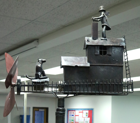 Artist Victor Moore created this kinetic, wind-powered sculpture for Naches Trail Elementary School. It is one of four whimsical whirligigs inspired by Tacoma's community and history. The figures in each whirligig tell a story using movement. This piece features a chimney sweep on the roof of a house. A dog looks up at the chimney. Even a slight breeze will cause the chimney sweep's broom to move up and down.