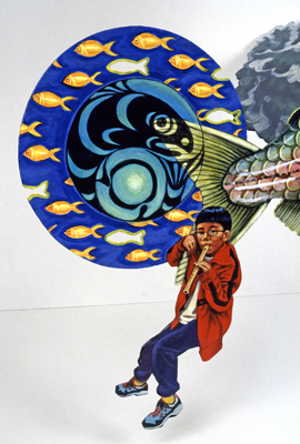 This artwork is part of ‘Raven Spirit Mobile’, a five-piece mobile created by artist Terry Furchgott. She created it for Illahee Elementary as a tribute to the school’s values and the area’s Native American heritage and history. A mobile is a sculpture that hangs balanced in the air with each part moving freely. This sculpture features five different winged animals. The animals represent important symbols in the cultures of the Native American Tribes of the Pacific Northwest. In each part, a circular emblem shows an image of the animal inspired by the artistic style of the Northwest Coast. This part features a salmon with students riding on its back. It symbolizes creativity, diversity, and learning together to achieve your goals. The artist notes, “Representing Water, the five species of salmon are the subject of many legends and a major food source to the people of the Northwest Coast. This Chinook salmon flies with wings made of water/waves, and is show with a music teacher and five students of different ethnicities on its back, each playing an instrument.”