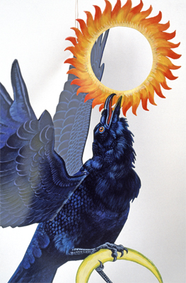 This artwork is part of ‘Raven Spirit Mobile’, a five-piece mobile created by artist Terry Furchgott. She created it for Illahee Elementary as a tribute to the school’s values and the area’s Native American heritage and history. A mobile is a sculpture that hangs balanced in the air with each part moving freely. This sculpture features five different winged animals. The animals represent important symbols in the cultures of the Native American Tribes of the Pacific Northwest. In each part, a circular emblem shows an image of the animal inspired by the artistic style of the Northwest Coast. This part features a raven holding the sun, moon, and stars with its beak and feet. It symbolizes the element of air, creative thinking, problem solving, and a good sense of humor. The artist notes, “Wily Raven, the Transformer, cultural hero, the trickster, creator of the world, is portrayed here central and alone as befits the Spirit Leader of Illahee Elementary.”