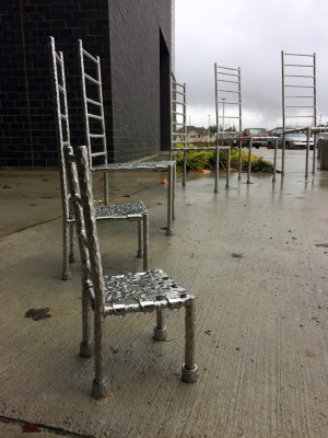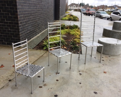Growth is a set of six stainless steel chairs created by artist Ries Niemi. They are part of a series of 14 chair sculptures titled ‘A Chair to Sit.’ Installed at the entrance of North Creek High School, the chairs encourage play and personal interaction. The artist describes the series as “anti-architecture intimate moments.” This set of chairs range in size, highlighting our perception of scale. Niemi notes, “The natural progression from small to large occurs in most things in nature, including, of course, people.”