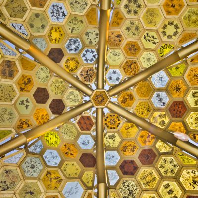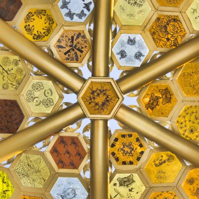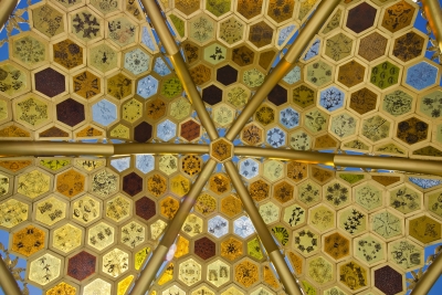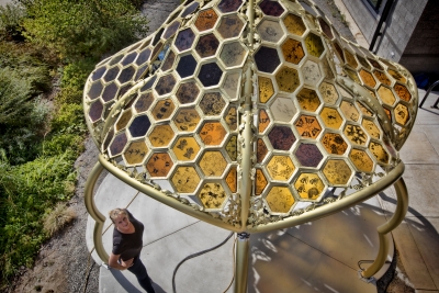Hansen invited students and the community to think of themselves as honeybees and contribute drawings for the artwork. Hansen scanned the students' drawings to create over 200 decals. She then fused these decals between layers of colored glass to create cells of a honeycomb. Just as each source of pollen creates honey with a different color and a different character, each glass cell is unique. Hansen notes, "A beehive houses a community which works both individually and collectively. Bees gather pollen and nectar, which they take back to the hive and create honey. The honey produced is used to subsist on later. In much the same way, the students gather information about their world as they go through the educational system. They learn how to work with themselves and others. Each has a unique approach to their learning, an individual experience like no other."