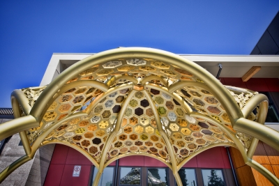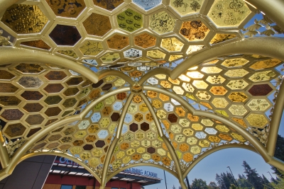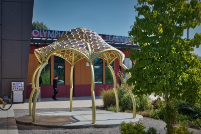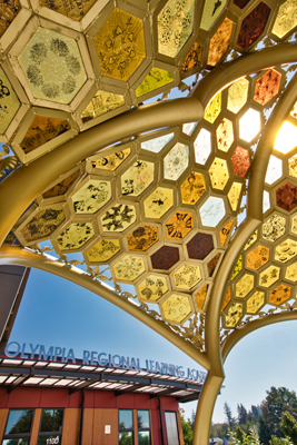 Shelter is a beehive-like structure created by artist Diane Hansen for the entrance of Olympia Regional Learning Academy (ORLA). The glass and aluminum artwork reflects the diversity and unique character of ORLA, a school for non-traditional and independent learners.