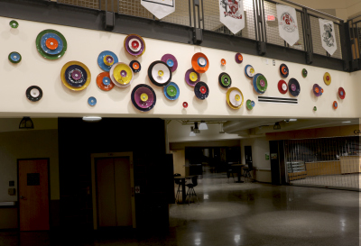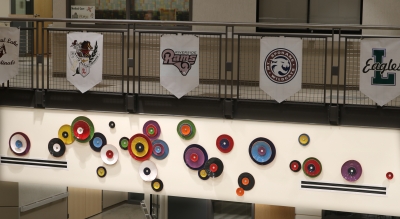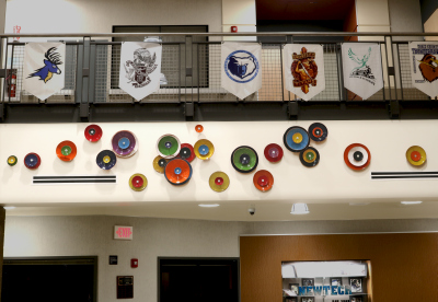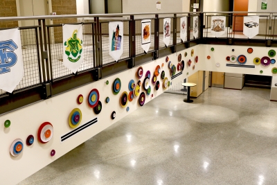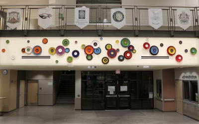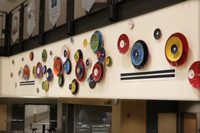 Constellate is a ceramic installation created by artist Evan Blackwell for the commons at NEWTECH Skill Center, part of Spokane Public Schools. The history of Spokane's brick industry and architecture inspired the artist's choice of materials. The installation is comprised of 304 colorful glazed disks that are layered to make 142 unique clusters. The clusters are grouped into constellations. Blackwell notes, "A constellation can be defined as a group of things of a similar kind, related or held together in a system. By this definition, people can form constellations through their shared ideas, efforts, or affinity for one another. At the NEWTECH Skill Center, the students, staff, faculty, and community members form a constellation that deepens in learning, connection, and enrichment over time."