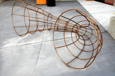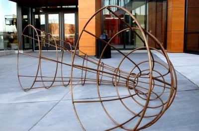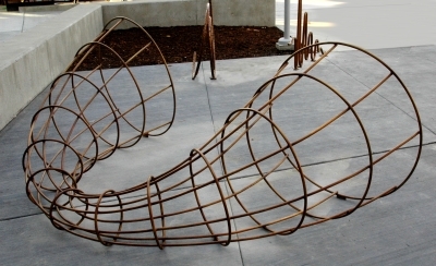 Worm Hole is part of artist Fernanda D'Agostino's six-part installation in the Whitehorse Hall plaza at Everett Community College. Patterns and theories from physics inspired her playful forms. She notes, "My project uses these forms, drawn from contemporary physics, to create a series of metaphorical sculptures for the lower courtyard. In each instance, dynamic forms are captured in the act of transformation, evoking both the evolving understanding of contemporary physicists and the power of the creative act." In this way, the installation brings together the arts and sciences. Both of these disciplines are taught in Whitehorse Hall.