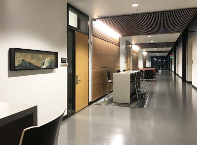 Where the Hills Meet the Clouds is part of artist Auburn Isaak's body of landscape paintings. She notes, "I draw my color palette from nature in its most elusive form; not as defined realism in its physical form, but as I interpret and depict it in my mind. This allows me to bridge abstract with the landscape that surrounds me." Isaak used a technique of poured acrylic paint to create this seascape. Curator Kathleen Garrett selected this artwork as part of a collection of artworks for Peninsula College in Port Angeles. The artworks installed in the Allied Health Building emphasize bright colors and unusual materials. This building is used for Nursing and Early Childhood Education programs.
