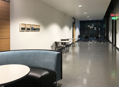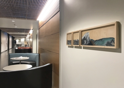 The Swell is part of artist Auburn Isaak's body of seascape paintings. She notes, "I draw my color palette from nature in its most elusive form; not as defined realism in its physical form, but as I interpret and depict it in my mind. This allows me to bridge abstract with the landscape that surrounds me." Isaak used a technique of poured acrylic paint to create this seascape. Curator Kathleen Garrett selected this artwork as part of a collection of artworks for Peninsula College in Port Angeles. The artworks installed in the Allied Health Building emphasize bright colors and unusual materials. This building is used for Nursing and Early Childhood Education programs.