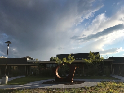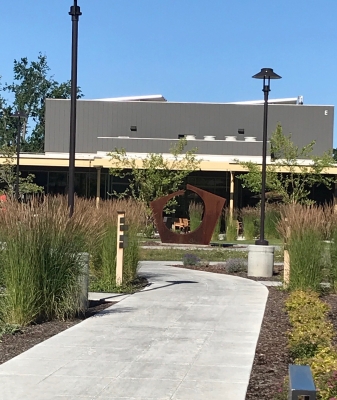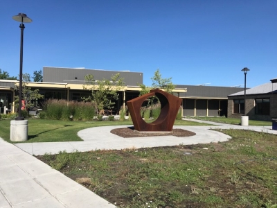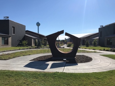 Artist Jan Hoy's sculpture dominates the central courtyard at the Walla Walla Veterans Home. In her own words, "no side has exactly the same dimensions which gives it a sense of movement even though it is very solid. The negative space in the center is also not a circle, but an ever changing ovoid shape that is at least as important and inviting to me as the outer structure. The outer form appears to hold the negative shape delicately on its side."