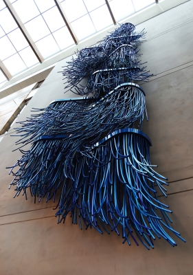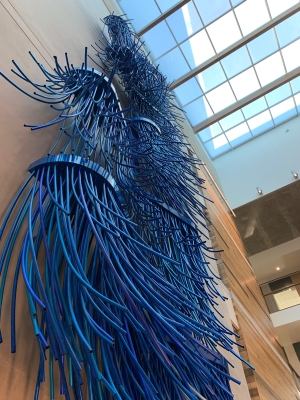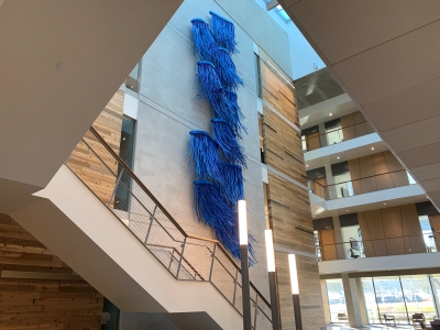 Brother created the installation artwork entirely from aluminum. She bent, formed, and powder-coated each aluminum piece to represent the color and flow of water.