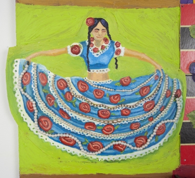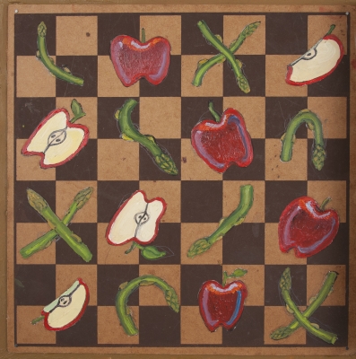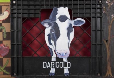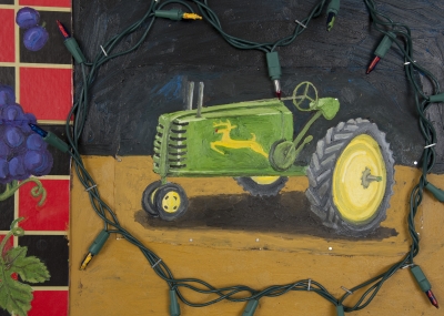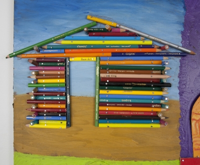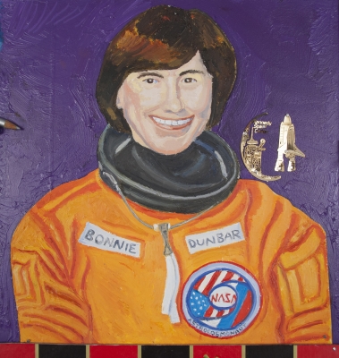 Ross Palmer Beecher's Sunnyside Up is a four-part artwork that uses found materials and objects to represent ideas of education and the culture of Sunnyside in Central Washington. The artist brainstormed with the art selection committee to find meaningful themes for the quilt. Then she gave her wish list of "supplies" to teachers and students, who set up a donation bin in the school. All of the found objects in the quilt are from the school or local thrift shops. For example, there is an oil painting of a dairy cow on a Darigold milk crate because milk from Sunnyside is used in Darigold products. Beecher also learned that the students at Washington Elementary play a lot of board games. She included quilt squares of chess, checkers, scrabble, cribbage, and card games, as well as some sports games. Altogether there are four quilts with a combined total of 26 different quilt squares. The imagery ranges from the farming communities, to student learning, to sunshine and sunglasses, to board games and sports, to Hispanic cultures, to astronaut Bonnie Dunbar who grew up in Sunnyside. Beecher notes that "I make traditional quilts and non-traditional quilts out of most anything besides fabric."