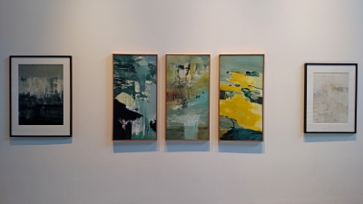 Yellow Pond is an abstract painting by artist Becky Knold. She notes that, “Perhaps it is a particular quality of the light on a foggy, Pacific Northwest afternoon, or the water’s calm reflections on the surface of a pond, or the shimmer of the wetlands at dusk. Or, just as often, it could be the striking and unique character of rocks, mountains, or trees that becomes my focus. . . This is what I want to paint—not the ‘realistic image’, but one that portrays something of the inner spirit and mystery of what I see.”