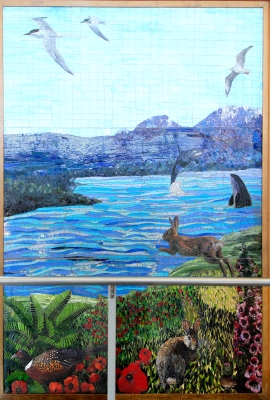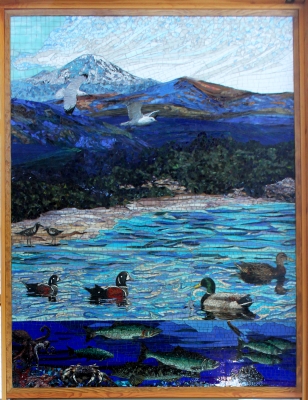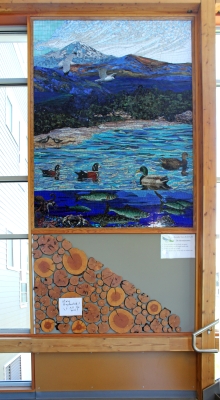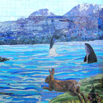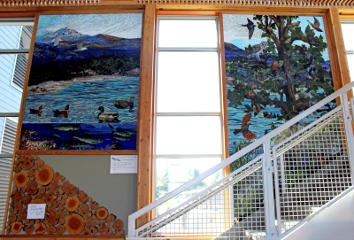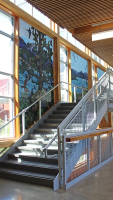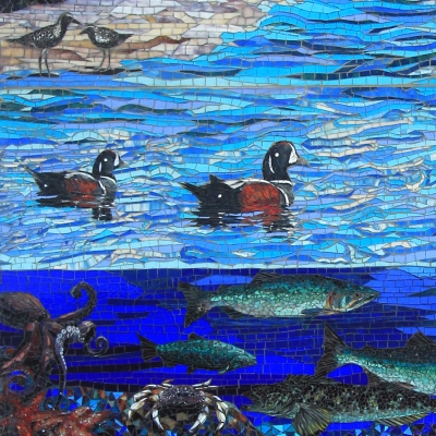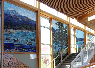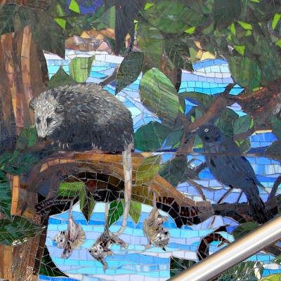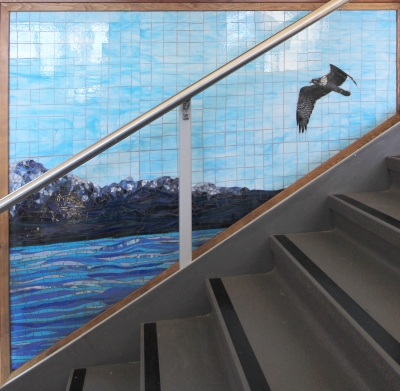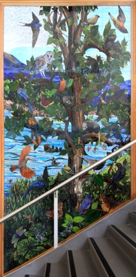 Puget Sound Tree of Life is made up of four glass mosaic murals created by artist team Carl Bryantand Sandra Bryant. The mosaics flow up a stairway, and they are filled with the animals, birds, plants and trees, and natural landmarks of Puget Sound, including Mount Rainier and the Olympic Mountains. A large fir tree dominates the second mosaic and is bursting with various species of birds, an opossum and its babies, a butterfly, a bird's nest, a squirrel, a chipmunk, and more. Life underwater in Puget Sound is shown with otters, salmon, crabs, starfish, an octopus, breaching orca whales, and more. The artists note, "We celebrate relationships between humanity and our environment, our human connections, how our experiences intertwine, our history, our feelings over time and of the moment." The imagery reflects a passion for exploration and discovery in our natural world, and an appreciation for its beauty.