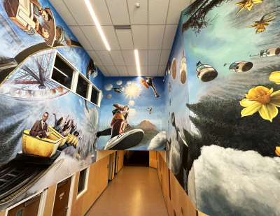 The three paintings by artist Ric Gendron (Arrow Lakes) at Washington State University show different elements of the Native American spiritual journey. On the Turning Away represents the final portion of that journey. Across the Universe (left) represents one’s first journey into the spirit world through ceremony. The next level of the spiritual journey is when one must separate one's self from the physical world, represented by I Am a Rock (center). And the final journey is being able to travel between the physical and spiritual levels represented through On the Turning Away (right).