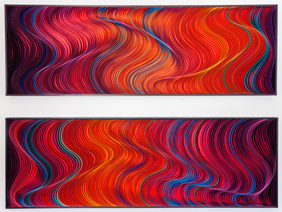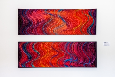 Artists Jason Hallman and Stephen Stum work together as Stallman Studio. They conceived a technique called “Canvas on Edge” in which they use paint and canvas as sculpture. They note, “The cut edge of the canvas creates an elevated line drawing and when seen at an angle, fields of color emerge as your perspective of the piece changes.” They are based on Whidbey Island, Northwestern Washington.