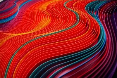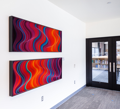 Salish Coast Elementary School in Port Townsend has two paintings by Stallman Studio that explore color, form, and movement. The artist team invented “Canvas on Edge,” a technique that uses paint and canvas as sculpture. They hand-paint large, 4x100 feet, sheets of raw canvas and cut it up into strips. Each strip is placed on its edge and molded as part of the larger artwork. The cut edges of the canvas are like a line drawing. When you look at an angle, fields of color swirl and flow together as you move around the artwork. Stallman Studio believes color is therapy.