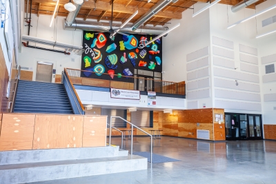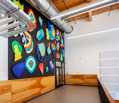 The installation Chromamotion by artist Andy Arkley fills and transforms the large commons area. It uses bright colors and simple shapes to energize the space. The shapes are flat painted plywood but they are shaded for a “trompe l'oeil” (trick of the eye) effect that makes them look three-dimensional.