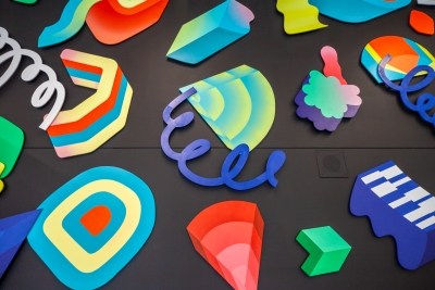 Andy Arkley creates vivid sculptural installations and interactive artwork. They often combine or are influenced by his work as a designer, musician, and animator. He notes, “my static installations use brightly colored, simple forms that are meant to invoke movement and a sense of joy about being alive.”