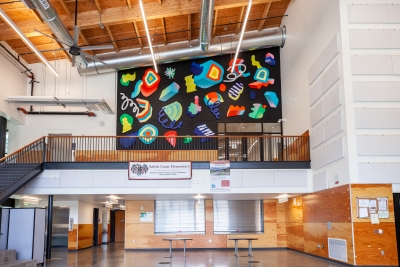 This artwork is part of a curated collection by Lele Barnett at Salish Coast Elementary School, on the Olympic Peninsula in Northwest Washington. The site is also a public library, YMCA, and an active town gathering place. The local art selection committee wanted the students and community to be excited about artists in and from their region. They also asked for fun and dramatic art that is colorful enough to brighten grey-sky days.