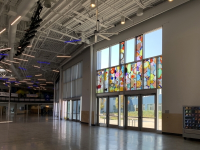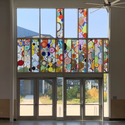 Artist Dick Weiss's All Colors Are Beautiful window installation for Federal Way High School is made of hand-blown glass circles, also known as rondelles. Weiss sees the shape of the rondelle as imitating the human face and creating a “sea of these faces” in the window design. He adds, “Just as with the students themselves, each piece of glass is unique…The overall feel is rich and warm, casting colors on the floor and over students. Everything is designed to say – you are special, and this is a special place.”
