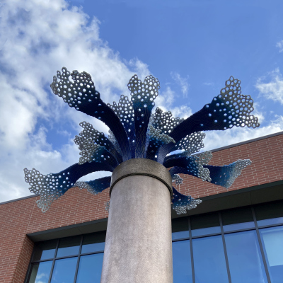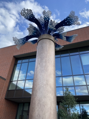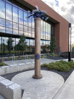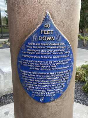 Artist team Judith Caldwell and Daniel Caldwell's 40 Feet Down sculpture celebrates the Spokane Valley-Rathdrum Prairie Aquifer and makes it visible. The natural groundwater reservoir holds ten trillion gallons of water and is located forty feet below Spokane Community College and its Main Building. The Caldwells' sculpture takes the playful form of a pipe bursting from the ground with water, like a fountain. The artists note that “The importance of water for nearly all living things cannot be overstated. Life on earth in its marvelous and myriad forms is only possible because of the presence of water.” The aquifer provides clean water to the entire Spokane region in Eastern Washington. It also helps to heat and cool Main Building using an open loop geothermal system that borrows water from the aquifer and then returns it unchanged.