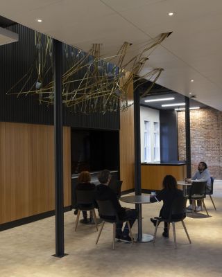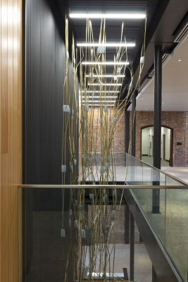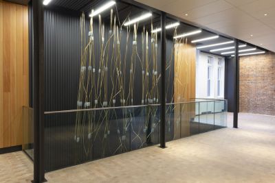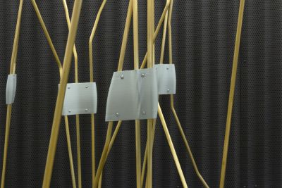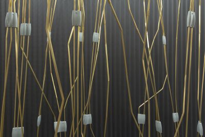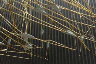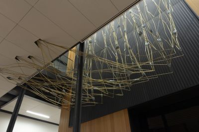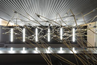 Entangled Agency by artist Lisa Little is a site-specific sculptural installation for the Evans School of Public Policy and Governance, located in Parrington Hall at the University of Washington. The artwork is inspired by ideas related to the work and studies done in the building. Entangled Agency represents the two main elements of public policy: complex networks and the people affected by them. It represents these forces through a net-like structure of connected and bent brass rods. The components that connect the rods together are another important and essential part of the artwork. These components are different shapes and sizes. They represent the people affected by public policies and remind us that each of those people is unique and independent. Entangled Agency asks us to remember that “policy is designed to create equity and inclusion and to provide for the well-being of the smallest elements in the system, such as an individual or a neighborhood.”