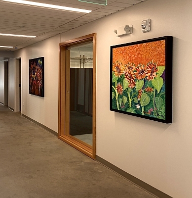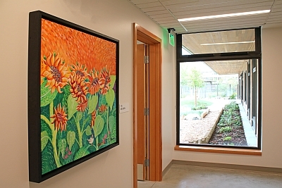 Consuelo Soto Murphy's Flores del Sol painting is inspired by the farming landscape of Eastern Washington. She often paints the fields, crops, and workers of the area in bright, energetic colors. This artwork is part of a curated collection by Renee Adams for the Maple Park Capitol Campus Child Care Center in Olympia. The art selection committee wanted the art to be mainly for the children. They wanted to focus on Northwest artists from diverse backgrounds and geographies, and artworks with color and nature-inspired imagery. The Child Care Center has six classrooms, as well as outdoor classrooms and play spaces, for eighty-four children.