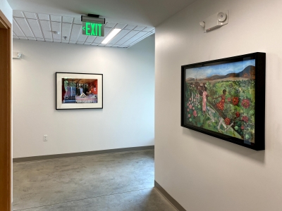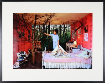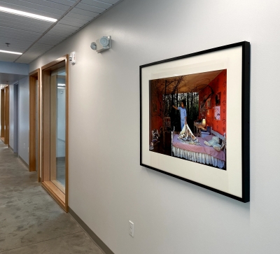 Jennifer Zwick’s The Dream (Touch) is part of her Constructed Narratives series of “non-linear short stories.” The photograph shows a young girl, who has the impression that her room has merged with a forest. The series of photographs focuses on adventurous young girls in beautiful but uneasy worlds. To create these images, Zwick draws from childhood fantasies and memories and builds life-sized environments. She explains that “By pushing these scenarios to an extreme conclusion, the girls become metaphors for our hyper-real childhood selves, where remembered emotions become stronger through time.” Zwick built the set for the image in the woods of Mount Vernon, Northwestern Washington, using her own childhood furniture. You can see the making of this artwork. This artwork is part of a curated collection by Renee Adams for the Maple Park Capitol Campus Child Care Center in Olympia. The art selection committee wanted the art to be mainly for the children. They wanted to focus on Northwest artists from diverse backgrounds and geographies, and artworks with color and nature-inspired imagery. The Child Care Center has six classrooms, as well as outdoor classrooms and play spaces, for eighty-four children.