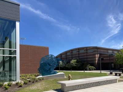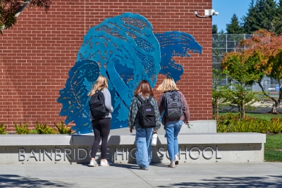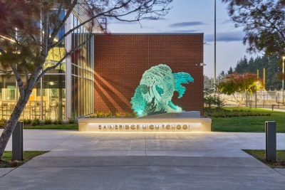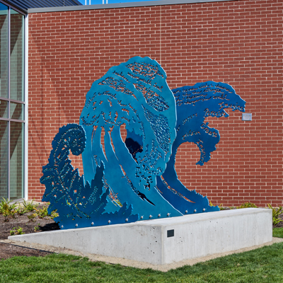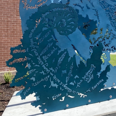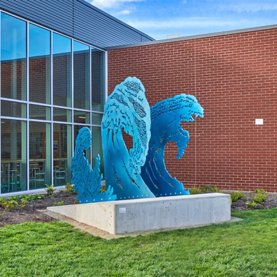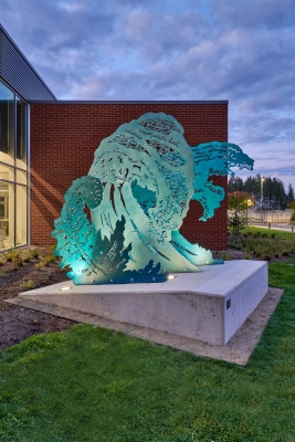 Artist Mary Coss's Surge sculpture represents a positive forward force. It references the similarities between an unfolding fern frond and a crashing wave. The fern is engraved with words and phrases on the theme “Becoming and Learning”, the building wave speaks to “Challenge and Resilience”, and the final transformation of the crashing wave tells a story of “Creativity and Imagination”. These themes and imagery represent the students who are discovering their place in the world. Coss notes "They create ripples, churn, and ebb and flow...students surge and break from school and home as they graduate and enter the larger world." The nature-based imagery also represents the Pacific Northwest’s forests and waterways of Puget Sound, the interconnectedness of the land and the sea.