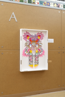 Look closely at this collage! It is made of overlapping layers of many cut-out photocopied drawings and shapes, cut paper fringes, and much more. They were made using office copy paper, office cardstock paper, translucent tracing paper, duct tape, colored pencils, markers, and ink in a hand-built shadowbox.