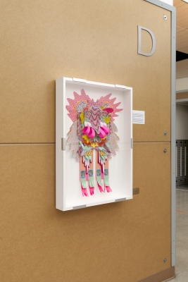 Look closely at this collage! It is made of overlapping layers of many cut-out photocopied drawings and shapes, cut paper fringes, and much more. They were made using office copy paper, office cardstock paper, translucent tracing paper, duct tape, colored pencils, markers, and ink in a hand-built shadowbox.