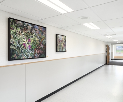 ‘Sweet Pea’ by Jane Degenhardt explores nature but also our inner selves. Degenhardt notes, “The process of weaving together intricate tangles in cloistered spaces has become a meditation in paint.” This artwork is part of a curated collection by Erin Dengerink in October 2021 at Foothills Elementary, in Buckley, Western Washington. The local art selection committee wanted artworks that are beautiful, intriguing, and spark imagination.