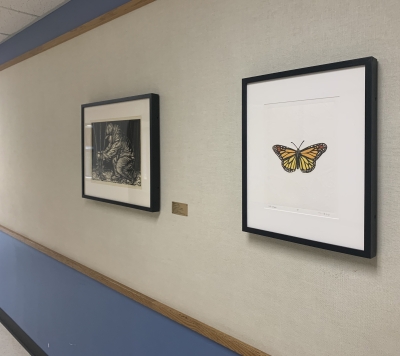 Vuelos Efímeros is a woodblock print by artist Christie Tirado. The title means "Ephemeral Flight" in Spanish. The print shows a monarch butterfly, which is the only butterfly to complete a two-way, north-south migration every year. They travel from the northern U.S. and Canada to the southern U.S., Mexico, and California, and back again every winter. Tirado notes, "As the daughter of immigrant parents, I have long admired the Monarch’s strength, determination, and will to traverse mountains and terrains, despite the harsh and uncertain living conditions. Similarly, my parents, as well as millions of other people in this nation have migrated, leaving their homelands in search of a better quality of life. Migration, for both the Monarch and people, represents an act of survival; unlike Monarchs however, many people end up hiding their beautiful wings, living in fear, and oftentimes working in laborious jobs that we now refer to as “essential.” This piece was inspired by the warm colors of resiliency, strength and determination that grace the wings of many Mexican migrant workers—particularly those who cultivate the land of this nation." Tirado sketched and carved all of the butterflies in this print by hand. The main butterfly is a 4-color print meaning that four different wood blocks were carved and printed, each with a different color ink. The embossed butterfly paper background is a separate, fifth wood block. This artwork is part of a curated collection by Erin Dengerink in October 2021 at Foothills Elementary, in Buckley, Western Washington. The local art selection committee wanted artworks that are beautiful, intriguing, and spark imagination.