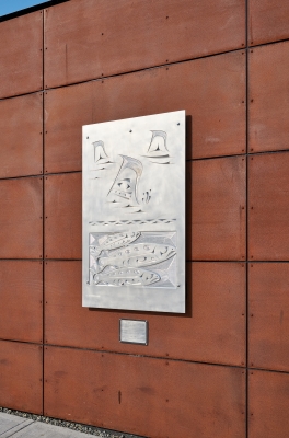 Artist Earl Davis created five carved aluminum panels to represent the elements of the world: Earth, Water, Sky, Celestial, Human. This Life Cycle of the Sea - Orcas & Salmon panel represents Water. All together, the panels show interconnectedness. They also hint at the traditional Native beliefs that all things are connected to each other and to all of us. Davis notes, “The Wolves and Orcas and Eagles depend on things like salmon and elk to survive. The salmon and elk depend on things like the cycles of sun and moon controlling the seasons. The humans depend on it all, as well as each other for survival, and yet it all depends on the humans to be good stewards to ensure the various parts of nature work together the way they should… The land is shaped by the sea, the sea is moved by the moon. The predators and prey live by the seasons that the sun and moon control. Somewhere along the line humans forgot the connections.”