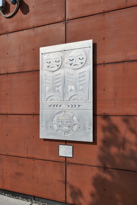 Artist Earl Davis created five carved aluminum panels to represent the elements of the world: Earth, Water, Sky, Celestial, Human. This Connections - Woman, Man & Sun panel represents Humans. All together, the panels show interconnectedness. They also hint at the traditional Native beliefs that all things are connected to each other and to all of us. Davis notes, “The Wolves and Orcas and Eagles depend on things like salmon and elk to survive. The salmon and elk depend on things like the cycles of sun and moon controlling the seasons. The humans depend on it all, as well as each other for survival, and yet it all depends on the humans to be good stewards to ensure the various parts of nature work together the way they should… The land is shaped by the sea, the sea is moved by the moon. The predators and prey live by the seasons that the sun and moon control. Somewhere along the line humans forgot the connections.”
