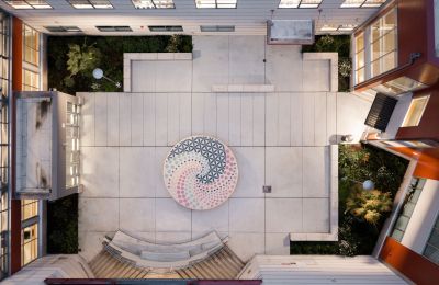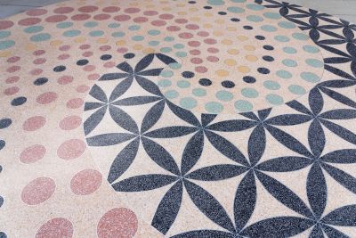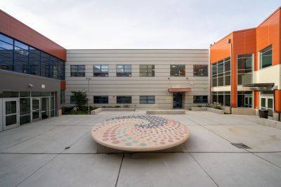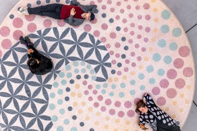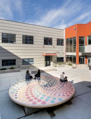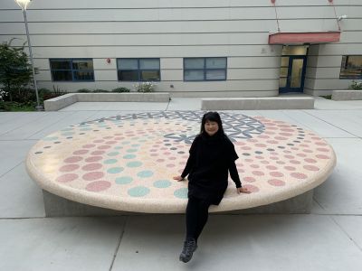Flowering Diversity by Etsuko Ichikawa is a free-standing circular bench at Foster High School in Tukwila, Western Washington. Ichikawa's main idea is to celebrate the cultural diversity of Foster High School and its surrounding communities, as well as a sense of harmony and fostering. Its imagery includes a yin and yang pattern with colorful dots and a flower of life pattern in black and white. The flowers, circles, and swirls suggest harmony, freedom, and growth. Ichikawa hopes the artwork is welcoming to everyone, and is a place for people to gather. She also sees it as connecting the past, present, and future of Tukwila.