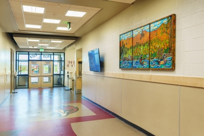 'Tapteal Journey' by Melissa Singh Cole is made up of 23 mosaic panels showing native plants and animals of the Yakima River ecosystem surrounding Tapteal Elementary in West Richland, Southeastern Washington. From the school’s website, Cole learned that “tapteal” is the Yakama language word for the Yakima River: “It means ‘the river that runs clean’ or ‘where two rivers meet.’ Many years ago, the Yakima River was full of salmon, which the Native Americans scooped out of the river and dried for food and fuel. Today, it is a major source of irrigation water for the Yakima Valley farms and orchards.” Each mosaic features a species specific to the Richland area including: wildflowers, riverbank plants and animals, mammals, reptiles and amphibians, birds and insects. The mosaic pieces also focus on food webs and will hopefully be used by teachers within their lessons. Some of the glass mosaic elements were glued onto butterfly or flower shapes by Tapteal Elementary students during workshops in the spring of 2021, led by the artist and a Tapteal art teacher.