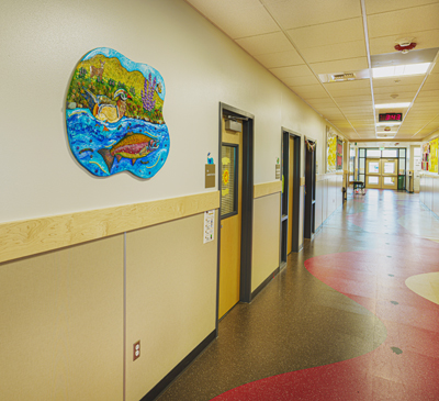 'Tapteal Journey' by Melissa Singh Cole is made up of 23 mosaic panels showing native plants and animals of the Yakima River ecosystem surrounding Tapteal Elementary in West Richland, Southeastern Washington. From the school’s website, Cole learned that “tapteal” is the Yakama language word for the Yakima River: “It means ‘the river that runs clean’ or ‘where two rivers meet.’ Many years ago, the Yakima River was full of salmon, which the Native Americans scooped out of the river and dried for food and fuel. Today, it is a major source of irrigation water for the Yakima Valley farms and orchards.” Each mosaic features a species specific to the Richland area including: wildflowers, riverbank plants and animals, mammals, reptiles and amphibians, birds and insects. The mosaic pieces also focus on food webs and will hopefully be used by teachers within their lessons. Some of the glass mosaic elements were glued onto butterfly or flower shapes by Tapteal Elementary students during workshops in the spring of 2021, led by the artist and a Tapteal art teacher.