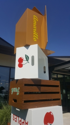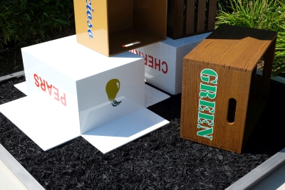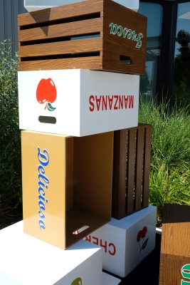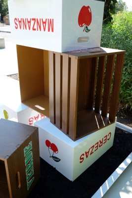 Artist Peter Reiquam's Fruit Crates for Kids – Cajas de Frutas para Niños sculpture represents the bountiful harvest grown and processed in the Yakima Valley of Central Washington. The names of the different fruits and colors are presented in both Spanish and English, reflecting the dual language mission of Lince Kindergarten.