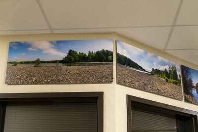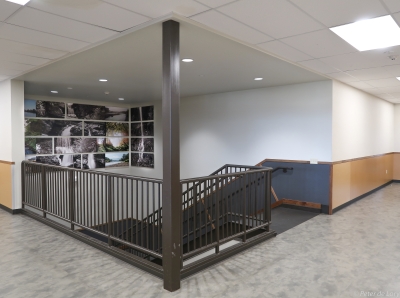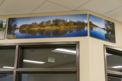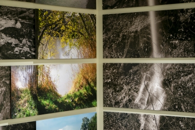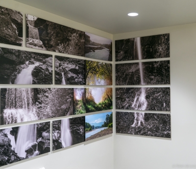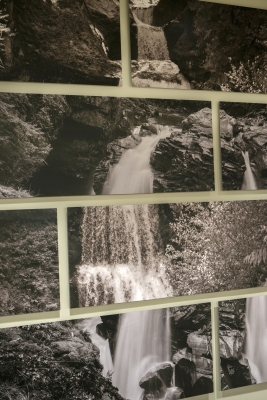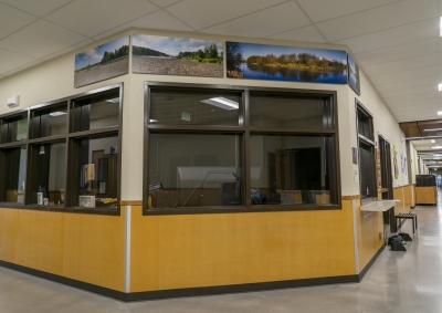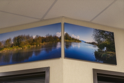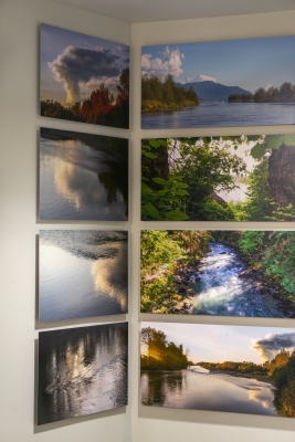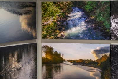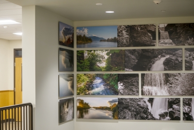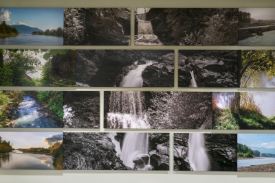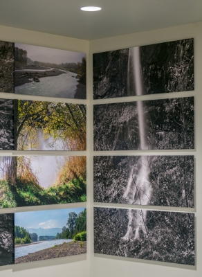 Peter de Lory's The River is a two-part artwork inspired by the nearby Nooksack River in Northwestern Washington. Like the regional Nooksack Valley Middle School, the Nooksack River unites the area from its beginnings at the base of Mount Baker to its mouth at Bellingham Bay on northern Puget Sound. De Lory's photos show the river in glimpses from along its banks: "Notable to me is that Nooksack remains a free-flowing river, with no dams." He walked along many sections of the river to show the many vistas, moods, and details of the waterway – from Nooksack Falls in the North Cascade Mountains, to Lower Racehorse Falls, to Deming, Lynden, and the Lummi Reservation at the mouth of the river. The free-flowing water is mysterious, but also acts as a connector and heart to the region.